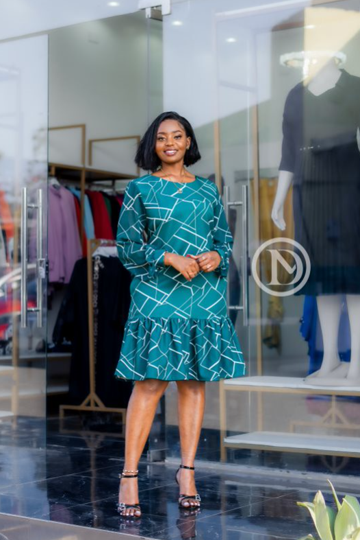 Beautiful long-sleeved green ruffle shift dress with white patterns.